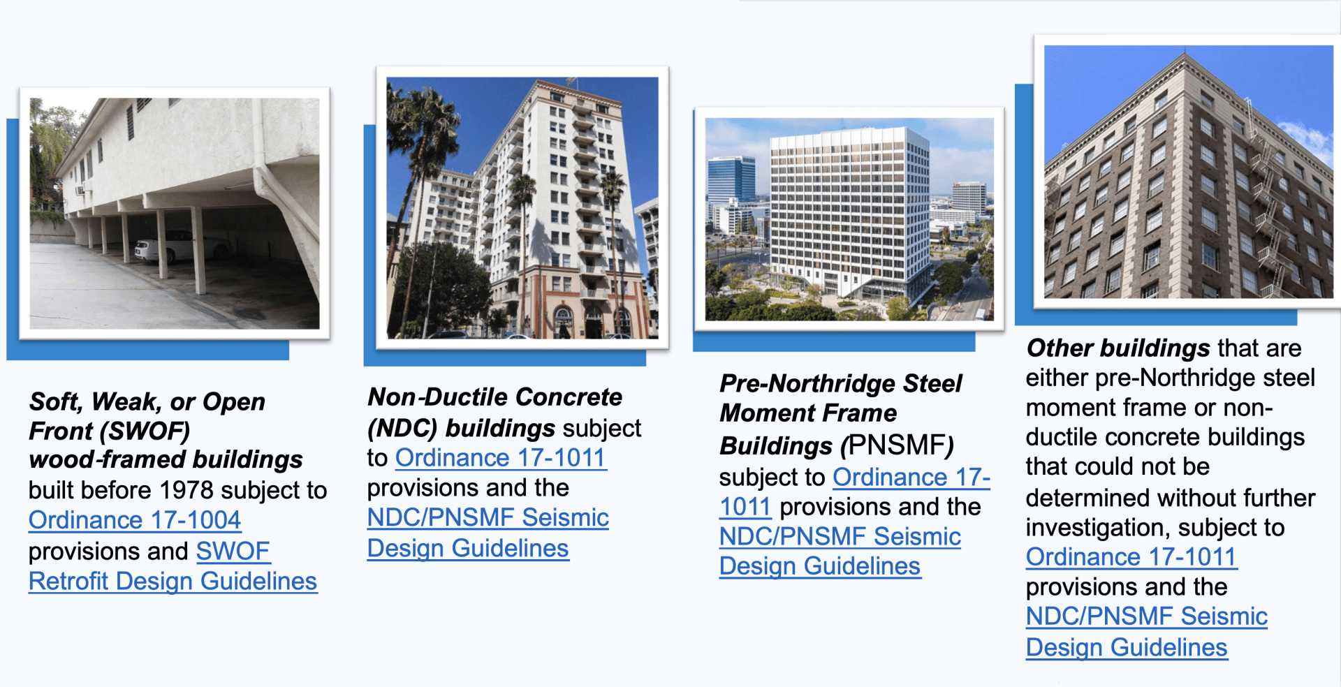 The City of West Hollywood Building and Safety Division received a Hazard Mitigation Grant for seismic retrofitting of wood framed buildings with soft, weak, or open front wall lines (SWOF), non-ductile concrete buildings (NDC) and pre-Northridge steel frame buildings (PNSMF) from the Federal Emergency Management Agency (FEMA) and the California Governor’s Office of Emergency Services (Cal OES). Grants are available for new retrofit projects for buildings that are currently on the City's Seismic Retrofit survey list.