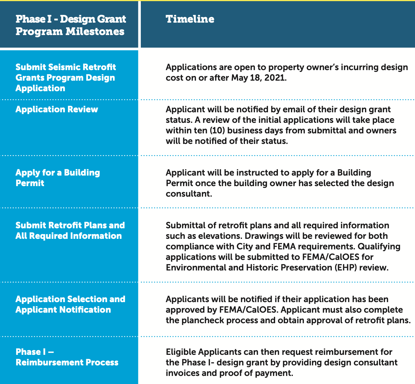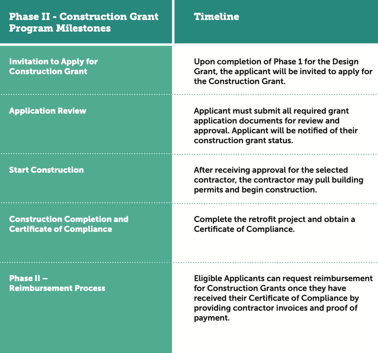 Applicants must meet all Program deadlines to retain eligibility for grant funding. Reimbursements for the grant will be issued in two (2) phases, the first phase after the completion of design and the second after the completion of construction.