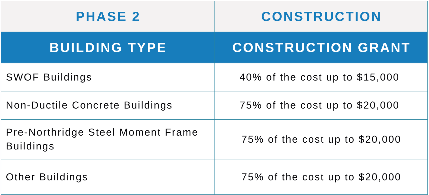 Grants for the Construction Phase will be capped as shown on the table below
